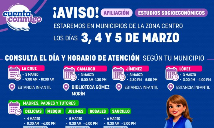 El miércoles la atención será en Delicias, Meoqui, Julimes, Rosales y Saucillo, y continuará el jueves de 8:30 de la mañana a 6:00 de la tarde. El viernes 6 de marzo será de 8:30 de la mañana a 3:00 de la tarde.