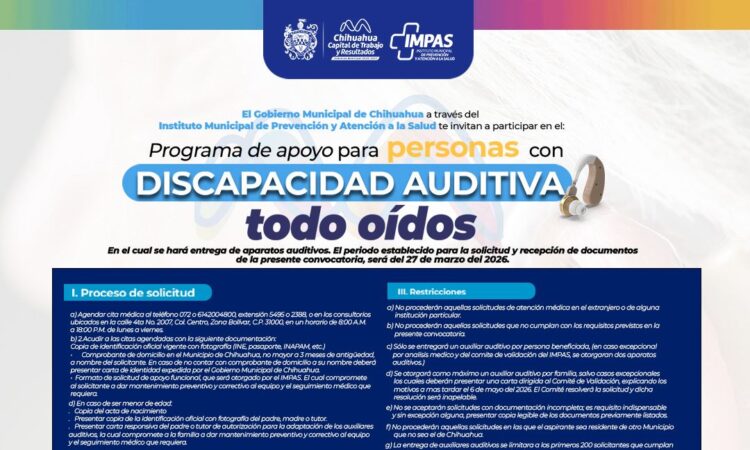 El Gobierno Municipal de Chihuahua, a través del Instituto Municipal de Prevención y Atención a la Salud (IMPAS), recuerda a la ciudadanía que continúa abierta la convocatoria “Todo Oídos”, la cual brinda aparatos auditivos de manera gratuita a personas con discapacidad auditiva.