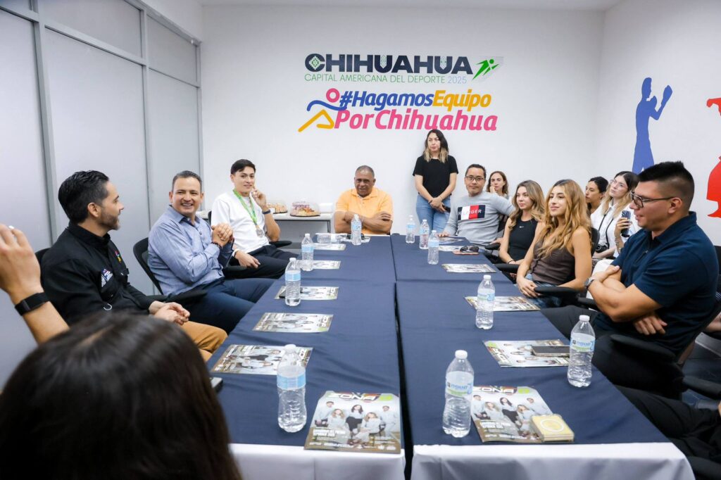 El alcalde de Chihuahua, Marco Bonilla, se reunió con atletas y entrenadores beneficiarios de “Meta Olímpica CUU”, para reconocer su esfuerzo y ser parte de esta iniciativa del Gobierno Municipal que busca darles seguimiento para que puedan llegar a los Juegos Olímpicos Los Ángeles 2028.