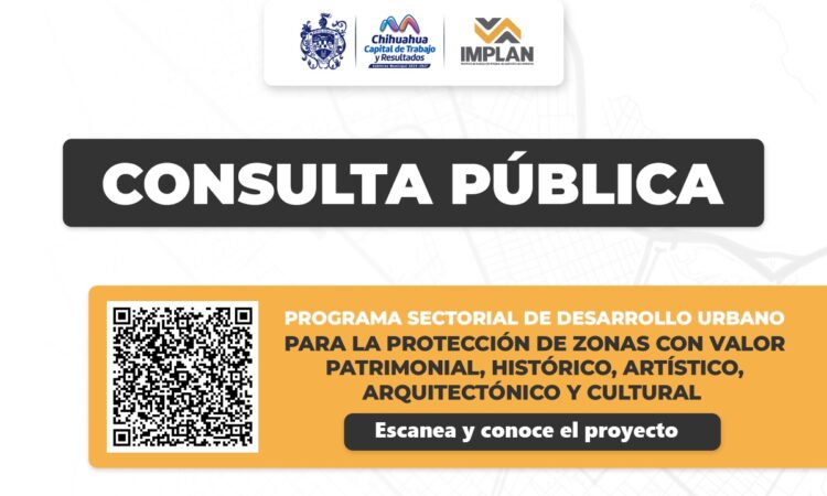 El Gobierno Municipal de Chihuahua, a través del Instituto de Planeación Integral del Municipio (IMPLAN), invita a la ciudadanía a participar en la consulta pública del Programa Sectorial de Patrimonio y del Programa Sectorial de Equipamiento Urbano y Espacio Público, acción que fortalece la planeación y consolida el compromiso cumplido con la ciudad.