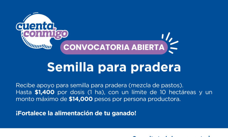 La Secretaría de Desarrollo Rural (SDR) informó a las y los productores que, a través del programa “Cuenta Conmigo en el Campo”, ya se encuentra disponible el apoyo para la adquisición de semilla de pradera, que busca fortalecer la productividad pecuaria y contribuir a la recuperación de áreas de pastoreo.
