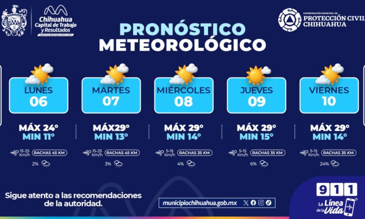 La Coordinación Municipal de Protección Civil informa que, para los próximos días, se prevén condiciones mayormente estables con cielos nublados, con temperaturas en ascenso gradual y baja probabilidad de lluvias, aunque con presencia de viento moderado en algunos días.