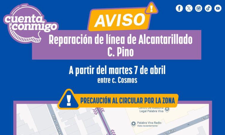 La Junta Municipal de Agua y Saneamiento (JMAS) de Chihuahua informó que este martes 7 de abril realizarán trabajos de reparación de la línea de drenaje en el cruce de las calles Pino y Cosmos.