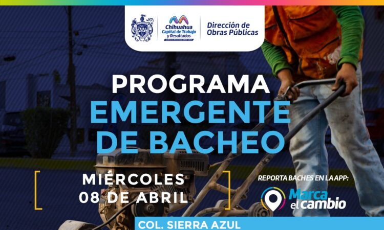El Gobierno Municipal, a través de la Dirección de Obras Públicas, realizará trabajos de bacheo este miércoles 8 de abril mediante el programa emergente en las calles de las colonias: Sierra Azul, Veredas del Sur, Junta de los Ríos, Revolución e Ignacio Allende, así como en la avenida Heroico Colegio Militar y los caminos al Ejido El Charco y La Casita-El Terrero.