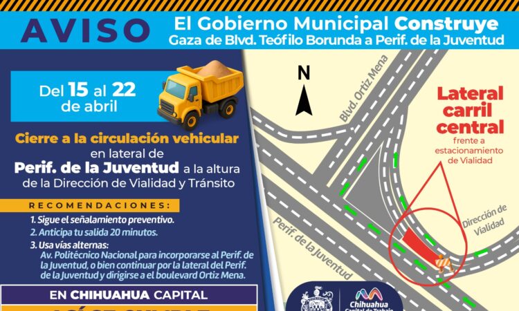 El Gobierno Municipal, a través de la Dirección de Obras Públicas, emite una alerta vial por el cierre temporal a la circulación en la lateral del periférico de la Juventud, a la altura de las oficinas de la Dirección de Vialidad y Tránsito, debido a trabajos de modernización de la línea de agua potable, como parte de la construcción de la Gaza de Incorporación.