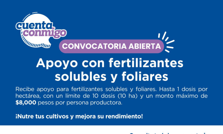 La Secretaría de Desarrollo Rural (SDR) informó que ya se encuentra disponible la convocatoria para que las y los productores agrícolas accedan al apoyo para adquisición de fertilizantes solubles y foliares, como parte del programa Cuenta Conmigo en el Campo.