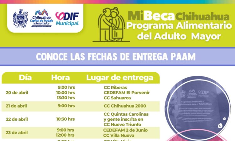 El Gobierno Municipal, por medio del DIF, informa a las y los beneficiarios del Programa Alimentario del Adulto Mayor (PAAM) edición 2026, las fechas en las que podrán acudir a su centro comunitario, del 20 de abril al 20 de mayo, por su apoyo: