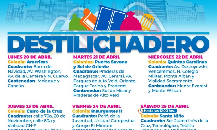 Para evitar acumulaciones de basura de grandes dimensiones en las viviendas, que podría generar plagas o problemas de salud, el Gobierno Municipal, a través de la Dirección de Servicios Públicos Municipales, informa el calendario del programa Destilichadero, que se realizará en siete colonias de la capital del 20 al 25 de abril.