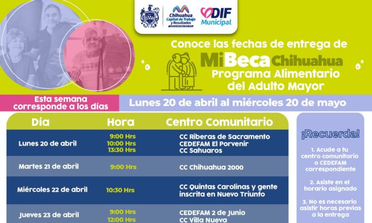 En atención al compromiso que el Gobierno Municipal tiene con las y los adultos mayores de Chihuahua Capital, para garantizarles una mejor calidad de vida, a través del DIF, se informa a las y los solicitantes del Programa Alimentario del Adulto Mayor (PAAM) los horarios y puntos de entrega, correspondientes a la semana del 20 al 24 de abril, en los siguientes centros comunitarios:
