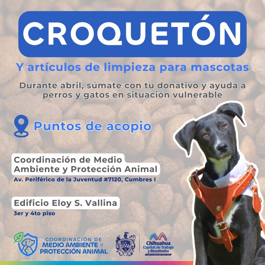 La Coordinación de Medio Ambiente y Protección Animal, invita a “Croquetón”, donde empresas, comercios y ciudadanía podrán donar croquetas y artículos de limpieza para beneficio de perros y gatos en situación vulnerable, mejorando su cuidado y fortaleciendo el apoyo a refugios del Gobierno Municipal.