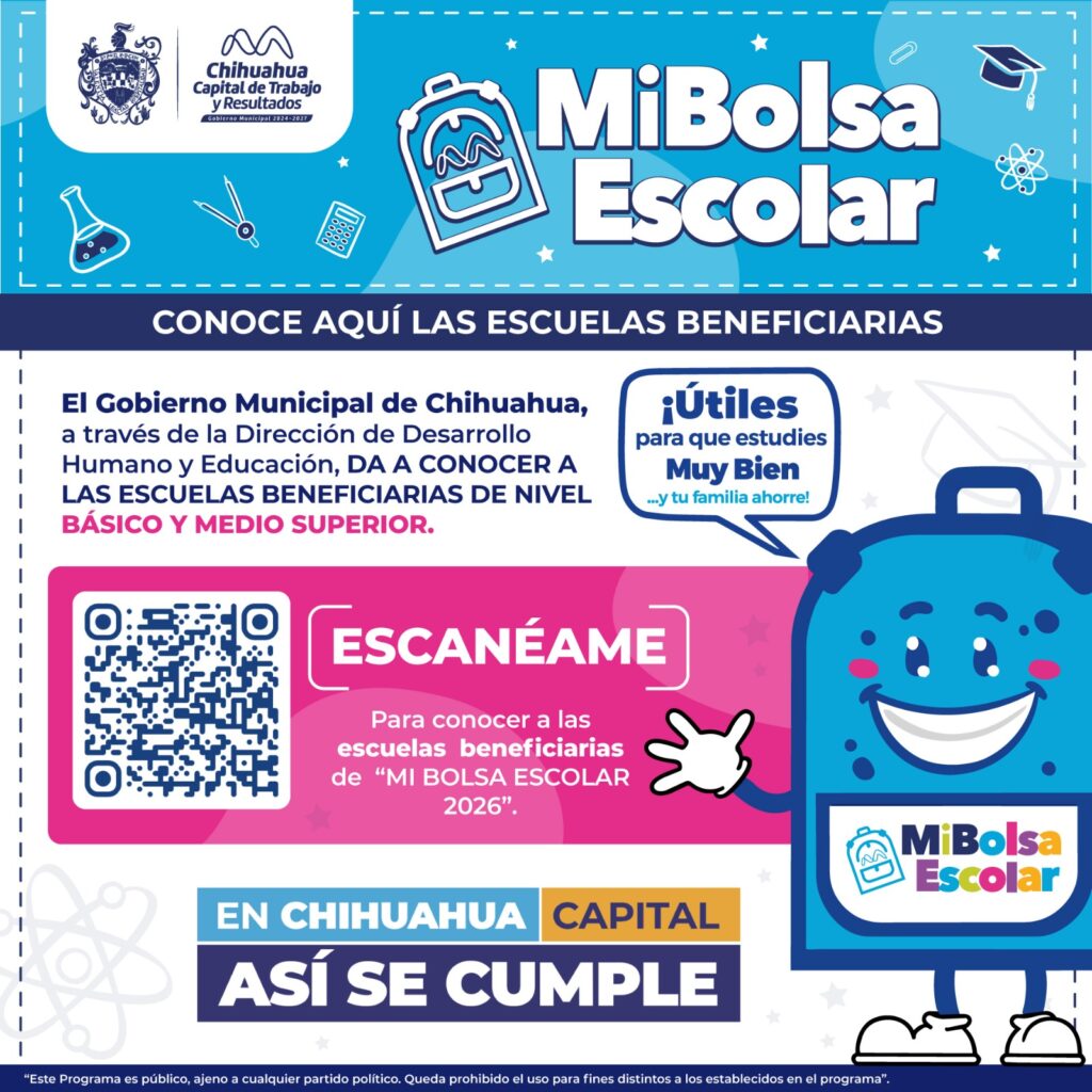 El Gobierno Municipal de Chihuahua, a través de la Dirección de Desarrollo Humano y Educación, informa que ya se encuentran disponibles la lista de escuelas beneficiadas del programa Mi Bolsa Escolar 2026.