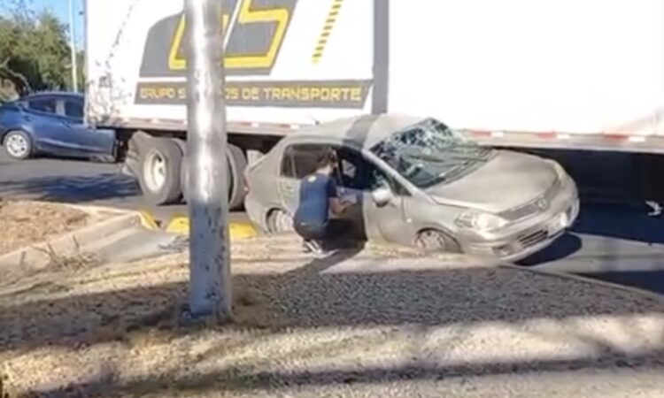 Un aparatoso accidente vial se registró en el trébol que conecta la avenida Tecnológico con la avenida Homero, luego de que un automóvil Nissan Tiida color arena se impactara contra la caja de un tractocamión perteneciente a la empresa Grupo Servicios de Transporte.
