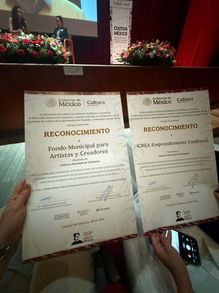 El Gobierno Municipal de Chihuahua, a través del Instituto de Cultura, destacó a nivel nacional durante la reunión del programa “Cultiva México: Banco de Buenas Prácticas en Gestión Cultural y Artística”, al lograr que los programas FOMAC e iCREA fueran reconocidos e integrados al primer catálogo nacional de 41 proyectos exitosos, beneficiando a la comunidad artística local al posicionar a Chihuahua Capital como referente en políticas culturales innovadoras y fortaleciendo el desarrollo del talento creativo del municipio.