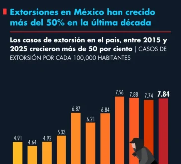 NacionalExtorsiones en México han crecido más del 50% en la última década.La redacción4 semanas ago18 febrero, 2026875En 2015 se registraron 4.91 casos por cada 100,000 habitantes, mientras que en 2025 la cifra alcanzó 7.84 casos,