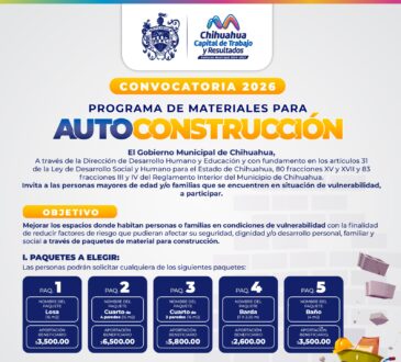 Las personas interesadas podrán elegir un solo paquete por vivienda, entre las siguientes opciones: losa de 16 m² con una aportación de 3,500 pesos; cuarto de cuatro paredes de 16 m² por 6,500 pesos; cuarto de tres paredes de 16 m² por 5,800 pesos; barda de 7 por 2.30 metros por 2,600 pesos; o baño de 4 m² por 3,500 pesos.