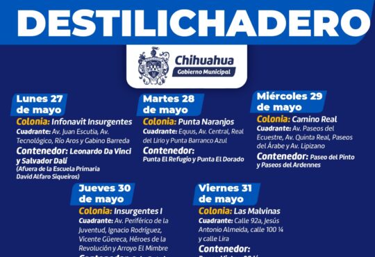 LocalEstará Destilichadero en cinco colonias del 27 al 31 de mayo.La redacción1 año ago25 mayo, 2024624Se pone a disposición de la población un contenedor en un punto fijo en un horario de 9:00 am a 3:00 pm de lunes a viernes.