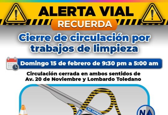 Local¡Recuerda! Por limpieza hoy cerrará distribuidor vial de Lombardo Toledano y 20 de noviembre.La redacción2 meses ago16 febrero, 2026277En un horario de 9:30 pm a 5:00 am