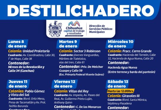 LocalVisitará programa Destilichadero siete colonias del 8 al 13 de eneroLa redacción2 años ago6 enero, 2024739En un horario de 9:00 de la mañana a 3:00 de la tarde de lunes a viernes