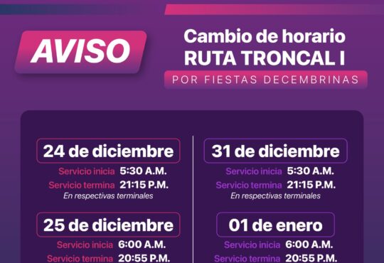 LocalAnuncian cambios en horarios de ruta troncal 1 por fiestas decembrinasLa redacción2 años ago24 diciembre, 2023787Durante los días 24 y 25 de diciembre habrá modificaciones de horarios en las primeras y últimas salidas de autobuses