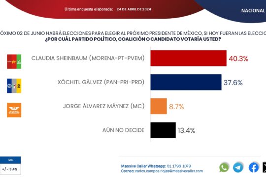 NacionalCerca de empate técnico entre Claudia y XóchitlMichelle Mtz2 años ago25 abril, 20242.4kAdemás, el tracking de encuestas realizadas desde el 29 de febrero a 24 de abril, muestra como ha evolucionado