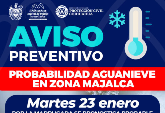 LocalAviso preventivo por probable caída de aguanieve en zona MajalcaRedacción Jr.2 años ago22 enero, 2024754La Coordinación Municipal de Protección Civil del Gobierno Municipal de Chihuahua informa que para hoy en la noche y en...