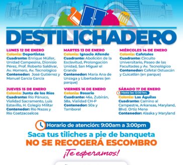 LocalEstará Destilichadero en 6 colonias del 12 al 17 de enero.La redacción1 día ago10 enero, 2026297Se pone a disposición de la población un contenedor en un punto fijo en un horario de 9:00 am a 3:00 pm de lunes a viernes.