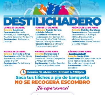 LocalEstará Destilichadero en siete colonias del 20 al 25 de abril.La redacción3 horas ago19 abril, 2026154En un punto fijo en un horario de 9:00 am a 3:00 pm de lunes a viernes y el sábado de 9:00 am al medio día