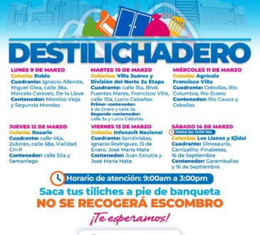 LocalEstará programa Destilichadero en ocho colonias del 9 al 14 de marzo.La redacción4 horas ago7 marzo, 2026130Se invita a reportar al número 072, en un horario de 9:00 de la mañana a 3:00 de la tarde de lunes a viernes.