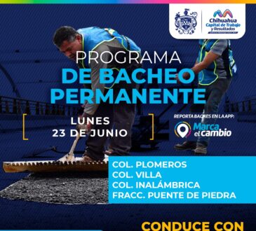 Cabe destacar que, este viernes 20 de junio en las colonias Pacífico y Colinas del Sol, así como en los Fraccionamientos Puerta Savona y Nuevo Milenio, se realizarán trabajos de bacheo.