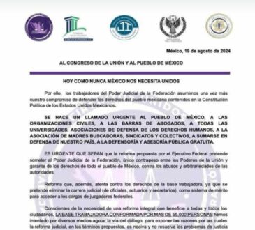 NacionalLlaman a unirse a la defensa del poder judicialMichelle Mtz1 año ago19 agosto, 20241.1kEsta organización ha subrayado la importancia de que dicha reforma, por las graves implicaciones que tiene para la carrera judicial