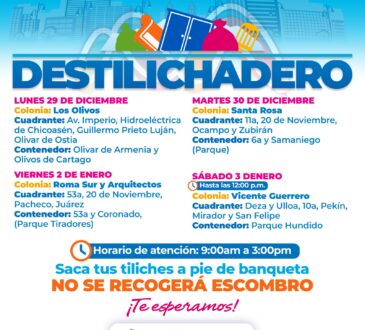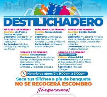 Para evitar acumulaciones de basura de grandes dimensiones en las viviendas, que podría generar plagas o problemas de salud, el Gobierno Municipal, a través de la Dirección de Servicios Públicos Municipales, informa el calendario del programa Destilichadero, que se realizará en siete colonias de la capital del 15 al 20 de diciembre.
