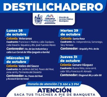 LocalEstará Destilichadero en ocho colonias del 21 al 26 de octubre.La redacción12 meses ago19 octubre, 2024631En un punto fijo en un horario de 9:00 de la mañana a 3:00 de la tarde de lunes a viernes
