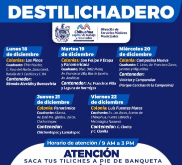 LocalVisitará Destilichadero nueve colonias del 21 al 25 de noviembreLa redacción2 años ago471El calendario del programa Destilichadero que se realizará del 21 al 25 de noviembre en nueve colonias de Chihuahua Capital.