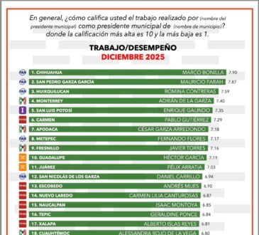 En el rubro de cercanía con la ciudadanía, el alcalde capitalino encabezó nuevamente el ranking nacional, al alcanzar una calificación de 7.82, un indicador que refleja la percepción positiva de los chihuahuenses