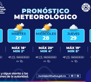 Se esperan valores mínimos de -2 grados centígrados (°C) en Casas Grandes y Madera, -1 en Guachochi, 0 en Juárez y 4 en Chihuahua, aunado a la presencia de vientos y nubosidad.