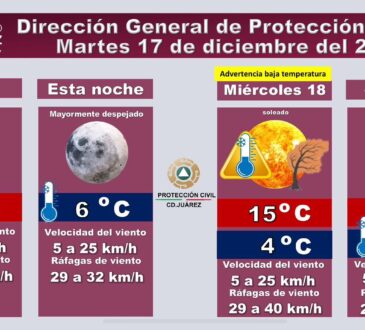 RegionalMantienen bajas temperaturas en JuárezMichelle Mtz10 meses ago17 diciembre, 2024589La Dirección General de Protección Civil emitió el reporte meteorológico para este martes 17 y los días posteriores, destacando condiciones...