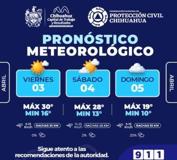 LocalCalor y probabilidad de lluvias ligeras para este fin de semana: Protección Civil Municipal.La redacción4 horas ago3 abril, 2026121Se prevé un descenso en las temperaturas del domingo con máximas de 19°C y probabilidad de lluvia del 20%, planifica actividades.