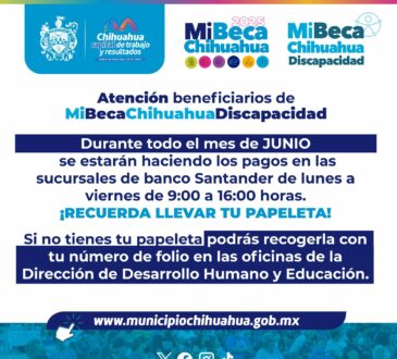 LocalContinúa el periodo de pago de Mi Beca Chihuahua Discapacidad.La redacción4 meses ago18 junio, 2025458El periodo de pago culmina el 30 de junio para realizar tu cobro.