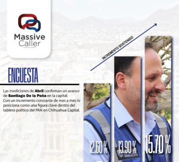 Ante la pregunta ¿Quién le gustaría para alcalde de Chihuahua por el PAN? los datos son contundentes, Santiago De la Peña pasa de 12.60% en febrero al 15.70% en abril, un incremento total de +3.10 puntos porcentuales.