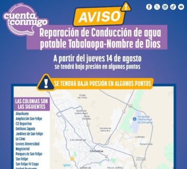 LocalReparará JMAS Chihuahua fuga en conducto de agua potable Tabalaopa-Nombre de Dios.La redacción2 meses ago13 agosto, 2025332Inician a las 9:00 horas, por lo que, durante la tarde, algunas colonias no tendrán servicio de agua potable.