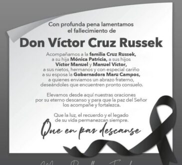 LocalFallece el empresario Víctor Cruz Russek, esposo de la gobernadora María Eugenia Campos Galván.La redacción4 horas ago5 octubre, 2025278Se desempeñó como presidente del Grupo CR3, consolidando una importante trayectoria empresarial marcada por su liderazgo
